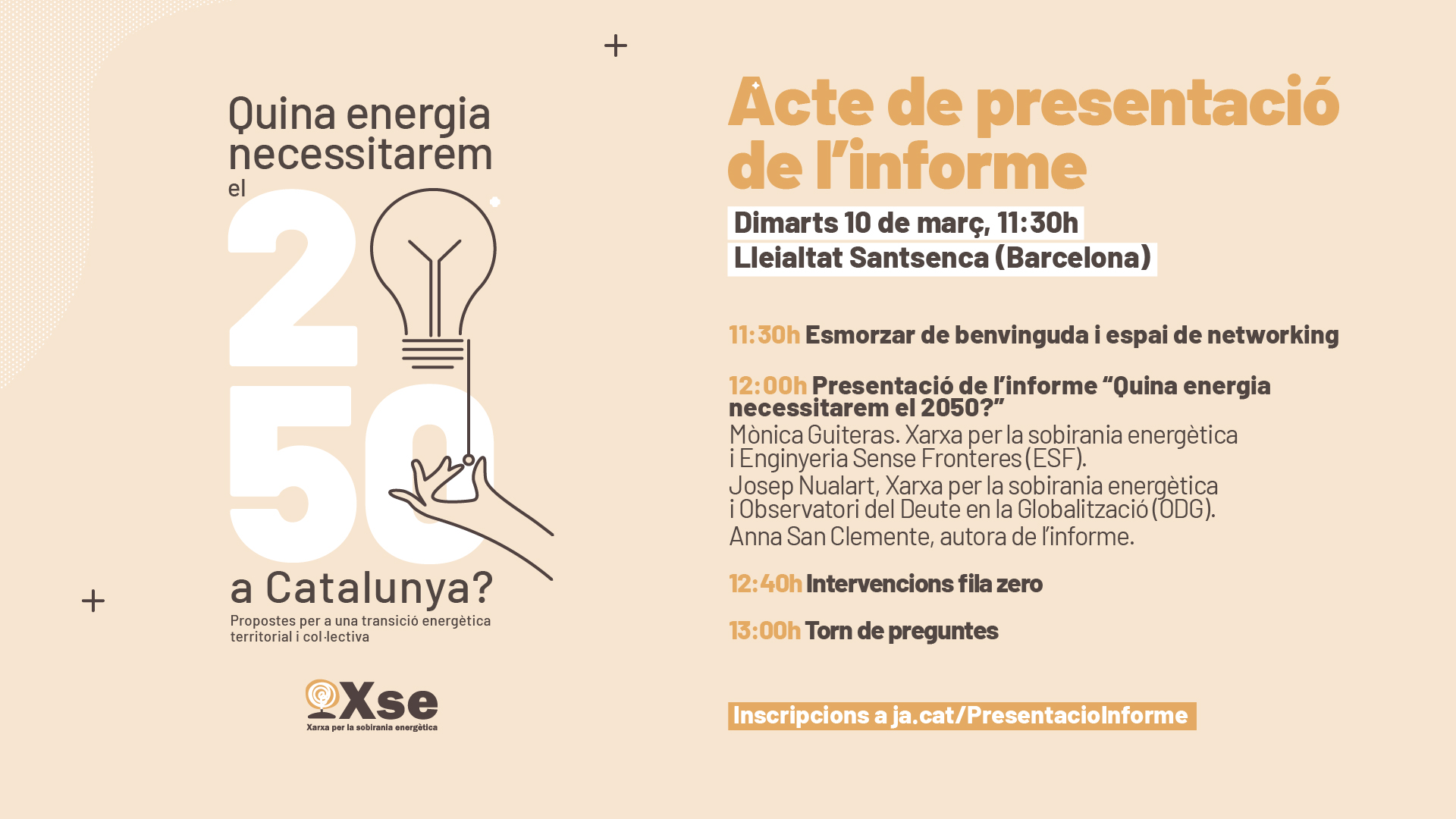 Per respondre a aquestes preguntes, des de la Xarxa per la sobirania energètica (Xse) hem passat els darrers mesos modelitzant dades i dibuixant escenaris. El resultat és l’informe “Quina energia necessitarem el 2050 a Catalunya?”, que presentarem públicament el proper dimarts 10 de març a la Lleialtat Santsenca (Barcelona).